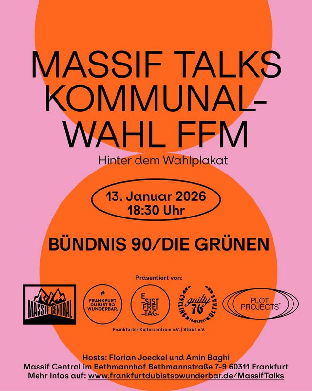 Dienstag 13. Januar: Massif Talks - Heute mit Bündnis 90 / Die Grünen![]() (Daniela) Zur OB Wahl haben Florian & Amin die Talks ins Leben gerufen. Jetzt gehts weiter. Sie schreiben: Frankfurt ist mehr als eine Stadt – das steht für uns, Florian Joeckel (guilty76 // Massif Central) und Amïn Baghi (esistfreitag // Frankfurt du bist so wunderbar) fest. Ein funktionierendes Stadtleben im Sinne der Frankfurter:innen und das Wohl der Stadt liegen uns sehr am Herzen – und basieren auf einer demokratischen Grundlage. Deswegen war und ist unsere Mission: Wir machen Wahlkampf – für die Demokratie. Nun kreuzen wir unsere „Waffen“ und schauen, was in unserem geliebten Frankfurt möglich ist. Nach unserem erfolgreichen Format im Rahmen der OB-Wahl kommen wir mit einer zweiten Runde zurück. Den Frankfurter:innen liegt am Herzen, wer in unserer Stadt Politik macht. Ihnen ist wichtig, dass parteiübergreifend Gesprächs-, Rede- und Austauschbedarf herrscht. Kooperieren statt Egoshooten. Im entspannten Gespräch mit mehreren Personen pro Partei werden Fragen beantwortet. Mitten aus dem Leben, über das Leben und aus dem Herzen von Europa. Wenn Ihr schon immer einmal wissen wolltet, welche Ziele, Positionen, Prioritäten für Frankfurt, welche Hobbies, Angewohnheiten aber auch Verhasstes, Privates, Träume, Wünsche und Visionen Euer/Eure Kandidat:in mit ins Rennen bringt: Seid dabei! Wir werden in der 90-minütigen Fragerunde Fragen von Frankfurter:innen stellen. Und danach? Bleibt genug Zeit mit den Kandidat:innen – zum lockeren Plausch bei einem Kaffee, Kuchen, Wein oder Bier. Einlass 18:00 Uhr, Beginn 18:30 Uhr, Eintritt frei Heute geht's los mit Bündnis 90 / Die Grünen: Katharina Knacker & Domitrios Bakakis (Fraktionsvorsitzende und Spitzenkandidat:innen) und Elke Voitl (Dezernentin für Gesundheit & Soziales) und Dr. Basdtian Bergerhoff (Stdtkämmerer und Dezerent für Finanzen, Beteiligungen & Personal). Weitere Termine: |