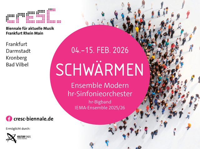 Mittwoch 04.- Samstag 14. Februar: Musikfestival cresc… Biennale für aktuelle Musik![]() (Daniela) Mit Konzerten, Uraufführungen und Installationen eröffnet cresc… 2026 unter dem Motto SCHWÄRMEN vom 4. bis 14. Februar 2026 einen Denkraum zwischen Natur, Gesellschaft und Kunst. Mit dem biennalen Festival cresc... Biennale für aktuelle Musik Frankfurt Rhein Main bündeln herausragende Kulturinstitutionen der Region seit 2011 ihre Kräfte: das Ensemble Modern mit der Internationalen Ensemble Modern Akademie und das hr-Sinfonieorchester mit der hr-Bigband. Die wechselnden und an Anzahl wachsenden Veranstaltungsorte und Kooperationspartner sowie das Programm selbst markieren den Anspruch des Festivals: herausragende Musik unserer Zeit für das Publikum der Metropolregion zu präsentieren. Unter wechselnden Themenstellungen bietet das Festival alle zwei Jahre ein facettenreiches Programm aktueller Musikströmungen, von Schlüsselwerken des 20. und 21. Jahrhunderts bis hin zu Uraufführungen junger Komponist*innen. Neben Konzerten umfasst das Programm auch interdisziplinäre Formate, die Musik mit anderen Kunstformen und gesellschaftspolitischen Diskursen verbinden. |