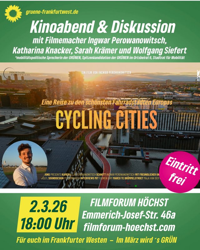 Montag 02. März: „Cycling Cities“ im Filmforum Höchst![]() (Daniela) Letzte Woche lief der Film in Offenbach, da hatte ich leider keine Zeit. Das wäre näher gewesen.. Aber da ich den Film unbedingt schauen will, radel ich heut nach Höchst. Wer kommt mit? Der Journalist und Filmemacher Ingwar Perowanowitsch reiste zwei Monate lang per Rad durch Europa. Er startete in Freiburg und besuchte mit Kamera im Gepäck Städte wie Paris, Gent, Amsterdam, Utrecht, Groningen, Hamburg und Kopenhagen. Perowanowitsch wollte erfahren, warum sie als besonders lebenswert gelten, was sie dafür machen und was deutsche Kommunen von ihnen lernen können. Sein Film „Cycling Cities“ dokumentiert die Suche nach guten Lösungen für den Stadtverkehr. Dafür spricht er vor Ort mit Planenden, politisch Verantwortlichen und Engagierten. Perowanowitsch zeigt, wie entschlossenes Handeln den öffentlichen Raum neu verteilen und die Lebensqualität steigern kann. Kinabend & Diskussion mit Filmemacher Ingwar Perowanowitsch, Dr. Katharina Knacker (mobilitätspolitische Sprecherin der GRÜNEN im Römer), Sarah Krämer (Spitzenkandidatin für den Ortsbeirat 6) und Wolfgang Siefert (Stadtrat für Mobilität). Filmforum Höchst, Emmerich-Josef-Str. 46a,65929 Frankfurt |