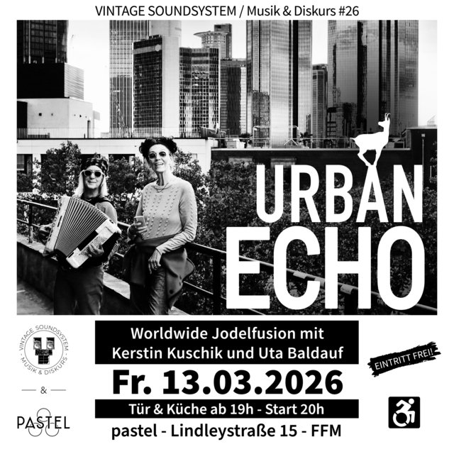 Freitag 13. März: VINTAGE SOUNDSYSTEM / International Jodeling Musik & Diskurs #26![]() (Daniela) Da wäre ich zu gerne dabei gewesen, denn die beiden Jodler:innen sind super! Urban Echo - Worldwide Jodelfusion Kerstin Kuschik und Uta Baldauf Jodeln und verwandte Techniken verbinden Lebensfreude, gemeinschaftliches Singen, Einfachheit und Kunstfertigkeit. So verbreitete sich alpines Jodeln über die USA nach Hawaii und erlebt heute sogar in Korea ein Revival. Ähnliche Naturgesänge heißen u. a. Yelli (Kamerun), Krimanchuli (Georgien) und Joik (Nordeuropa). Das Interesse wächst weltweit. An diesem Abend nimmt Euch das Duo zart&zünftig – Kerstin Kuschik (voc) und Uta Baldauf (acc) – mit auf eine musikalische Reise. Nach einem kurzen Diskurs hören Sie alpine und internationale Jodler sowie Rock-, Blues- und Jazz-Songs mit jodlerischen Überraschungen – humorvoll, frisch und mit Augenzwinkern. pastel, Lindleystraße 15, barrierefrei, FFM, Tür & Küche ab 19:00 Uhr, Beginn: 20 Uhr NÄCHSTE TERMINE: |