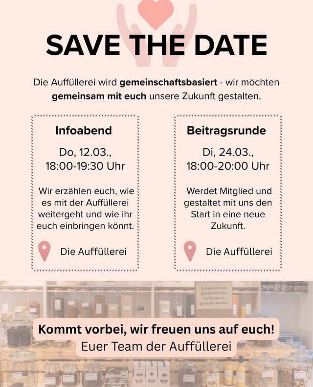 WICHTIGE INFORMATIONEN AUS DER AUFFÜLLEREI![]() (Daniela) Der tolle Unverpacktladen DIE AUFFÜLLEREI in Bornheim stand kurz vor der Schließung. ABER es haben sich tolle Menschen zusammengetan, die den Laden erhalten wollen. SIe freuen sich, wenn noch weitere engagierte Menschen dazu kommen. Der Unverpacktladen Die Auffüllerei lädt ein zu einem besonderen Abend: der ersten Beitragsrunde und DAVOR gibt es einen Infoabend. Das bedeutet - Menschen, die diesen Laden lieben, entscheiden gemeinsam, wie sie ihn tragen wollen. Neue Menschen können sich von einem solidarischen Finanzierungsmodell inspirieren lassen. Aber wir machen auch Nägel mit Köpfen: Wer dabei ist, sagt verbindlich, was er beitragen kann. Kein Druck, kein Vergleich. In eigener Verantwortung. Infoveranstaltung zur Beitragsrunde: 12. März, 18 Uhr |