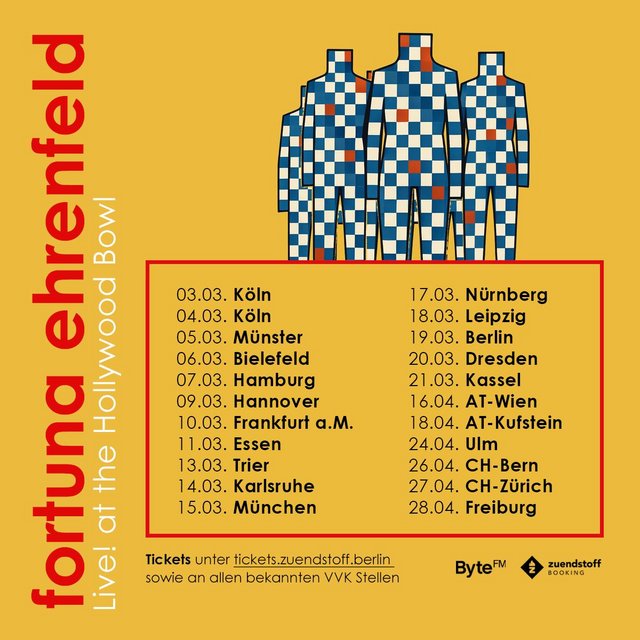 Donnerstag, 10. März: Fortuna Ehrenfeld![]() (Uwe) Weil wir die Band hier schon diverse Male angekündigt haben, steckt bei einigen von Euch vielleicht noch die Einschätzung im Hinterkopf, dass Martin Bechler und Begleitung hervorragende Songs schreiben. Nach einem Jahr Pause kommt Bechler mit einer neuen Platte auf Tour. Wer Fortuna Ehrenfeld bisher noch nicht gesehen hat, sollte hingehen. Ich würde mir ja eine Setlist mit seinen ruhigeren Nummern wünschen, weil diese Lieder berührender sind, wahrscheinlich macht er aber eher Krach. So wird das Ereignis angekündigt: „Und wie immer werden die Fortuna Shows ein unberechenbarer Tritt ins Herz für alle Freund:innen der schamlosen Melancholie und gepflegten Eskalation. Sei dabei, wenn aus den Fortuna-Hymnen über das Leben, die Liebe und die Abgründedazwischen ein kollektiver Pulsschlag wird.“ Zoom / F., Carl-Benz-Str. / Einlass 19 Uhr |