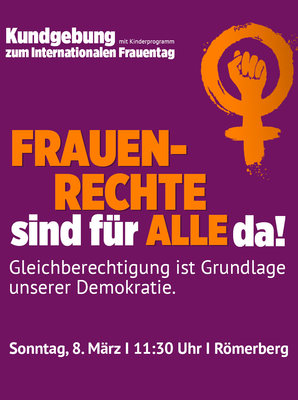 Sonntag 08. März: Frauenrechte sind für ALLE da! - Kundgebung zum Internationalen Frauentag![]() (Daniela) Bühne: Politische Statements & Musik mit Aufmischen und Anne Breick Rahmenprogramm: UNSERE FORDERUNGEN: Frauenrechte sind Menschenrechte – und machen unsere Gesellschaft besser! Sonntag, 8.3.2026, 11:30 Uhr, Römerberg |