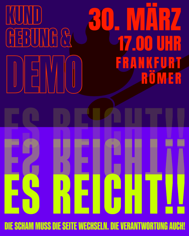 Montag 30. März: SOS DEMO: ES REICHT! DIE SCHAM MUSS DIE SEITE WECHSELN, DIE VERANTWORTUNG AUCH!!![]() (Daniela) SOS DEMO: Stoppt die strukturelle Gewalt. Wir fordern das Ende eines Systems, das männliche Gewalt verharmlost und Frauen als verfügbare Objekte betrachtet. Wir stehen solidarisch an der Seite aller Betroffenen – und wir fordern Konsequenzen! WIR RUFEN ZUR KUNDGEBUNG MIT ANSCHLIESSENDER DEMO AUF! WANN: Montag, 30.März, 17:00 Uhr - circa 20:00 Uhr Lasst uns gemeinsam zeigen, dass Frankfurt sexualisierte Gewalt nicht toleriert. Es reicht! Die Scham muss die Seite wechseln! Die Verantwortung auch! |