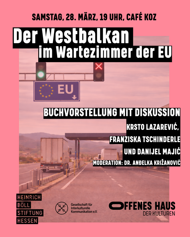 Samstag 28. März: Der Westbalkan im Wartezimmer der EU![]() (Daniela) Was bedeutet es, im „Wartezimmer der EU“ zu sitzen? Und warum kommt der Beitrittsprozess der Staaten des Westbalkans seit Jahren nur schleppend voran? Diese Veranstaltung widmet sich den politischen, gesellschaftlichen und wirtschaftlichen Perspektiven der Region und den Gründen für die anhaltenden Verzögerungen auf dem Weg in die Europäische Union. Im Zentrum steht ein moderiertes Gespräch mit den Autorinnen des Buches Der Westbalkan im Wartezimmer der EU: Krsto Lazarević, Franziska Tschinderle und Danijel Majić. Krsto Lazarević und Danijel Majić sind Hosts des Podcasts „Neues vom Balla-balla-Balkan“ Weitere Gesprächspartnerinnen sind angefragt. Die Moderation übernimmt Anđelka Križanović, die sich seit vielen Jahren mit politischen Entwicklungen und Transformationsprozessen im Westbalkan beschäftigt. Ausgehend von den Analysen und Reportagen des Buches werden unter anderem folgende Fragen diskutiert: Welche Staaten befinden sich derzeit im EU-Beitrittsprozess? Welche Erwartungen und Hoffnungen sind mit einer Mitgliedschaft verbunden? Und welche politischen, strukturellen und geopolitischen Faktoren verzögern den Beitritt? Im Anschluss besteht die Möglichkeit zum Austausch mit den Autor*innen bei einer musikalischen Untermalung. Samstag, 28. März 2026, 19:00 Uhr, Cafe KoZ, Mertonstrasse 26, Frankfurt |