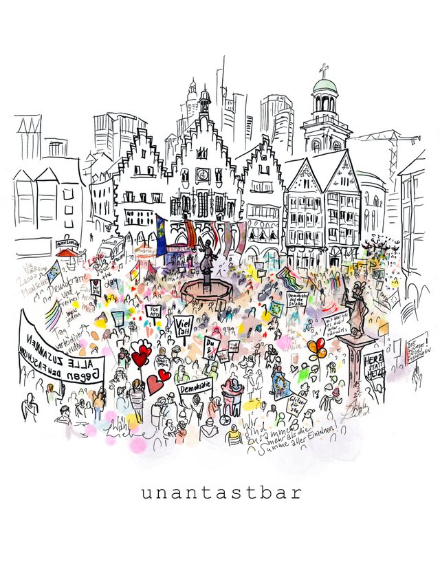 x-Mas Geschenketipp: „MEINE STADT, IHRE VIERTEL UND IHRE MENSCHEN”![]() (Daniela) In dem vorher beschriebenen Buch LIEBLINGSORTE gibt es auch Zeichnungen von Sibylle Lienhard. Sibylle ist Architektin & Urban Sketcherin. Vom Bankenturm bis zur Trinkhalle zeichnet sie Frankfurt, so wie sie sie selbst erlebt - mittendrin vor Ort. Es entstehen dabei ganz außergewöhnliche Wimmelbilder, private kleine städtische Szenen oder ganze Stadtpanoramen. Ich habe mich in das Bild “Unantastabar” verliebt und wünsche es mir zum Geburtstag. Ich war nämlich nicht nur bei der dargestellten Demo dabei, sondern habe Síbylle auch live zeichnen sehen. Café Karin, Großer Hirschgraben 28, 60311 Frankfurt am Main, Öffnungszeiten: Mo – So: 9:00 – 19:00 |